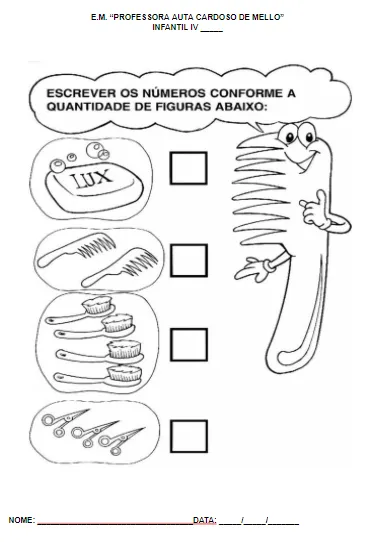 Conte os objetos de higiene pessoal e registre o numeral correspondente a quantidade de cada conjunto.