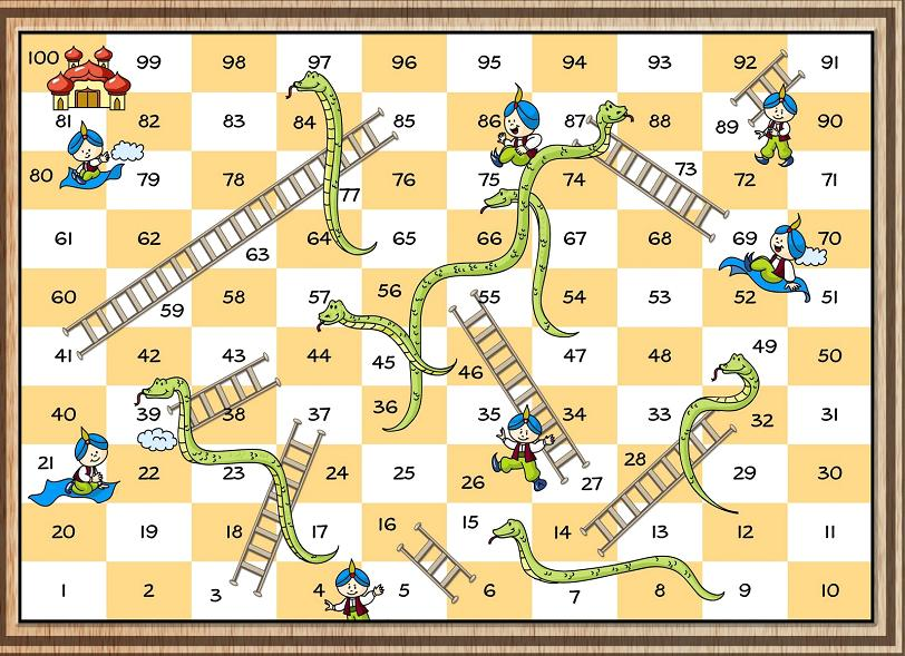 COMO JOGAR: Os jogadores lançam os dados. Aquele que tirar a numeração maior, dará início ao jogo. O primeiro jogador lança novamente o dado e “anda” nas casas numeradas, de acordo com o número sorteado no dado. Caso pare em uma casa em que haja uma escada, poderá subir por ela. Porém, se parar em uma casa em que tenha uma serpente, cairá. Ganha o jogo quem chegar primeiro, na última casa.